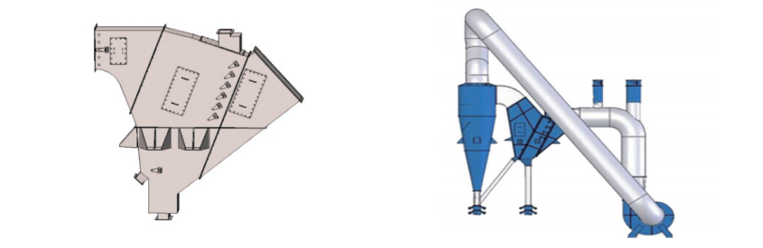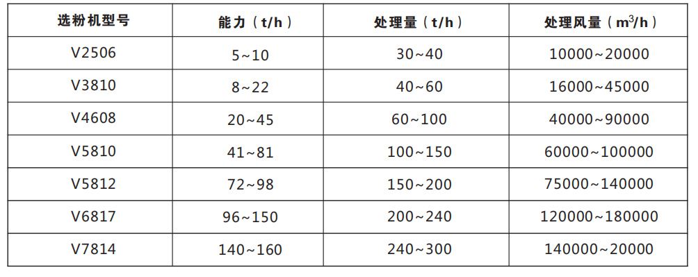 V型选粉机是专门针对盘磨机粉磨特征而开发的粗粉分级设备,适宜分离0~1mm、0~1.5mm和0~2mm的产品,它克服了离心式、转子式选粉机只能选细粉;振动筛只宜筛分粗粒,对细粒其筛分效率低且易糊筛和更换频繁的缺点。在实际应用中,该项系统负压循环,布置紧凑,噪音低,扬尘少,是目前国内外性能较好的粗粉分选装备。