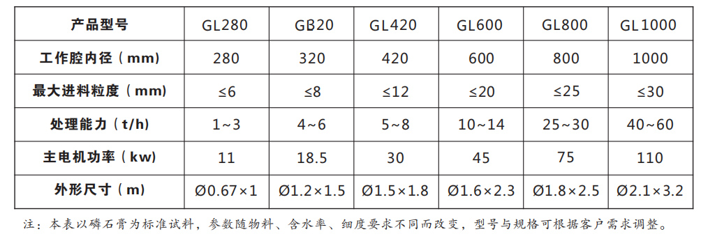 GL环辊磨为立式结构,电机和主机间通过皮带传动,进料口在主机上方,出料口在主机下方,工作腔分级设置,可串联构成不同数目的工作室,主轴垂直于地面,主轴上串联转子盘,转子盘间均布多组碾辊,当主轴旋转时,带动转子盘同步旋转,碾辊在转子盘上既自转也公转,物料则在重力的作用下降落,在降落的过程中不断被处于较下层的碾辊反复辊压,至出料口排出。